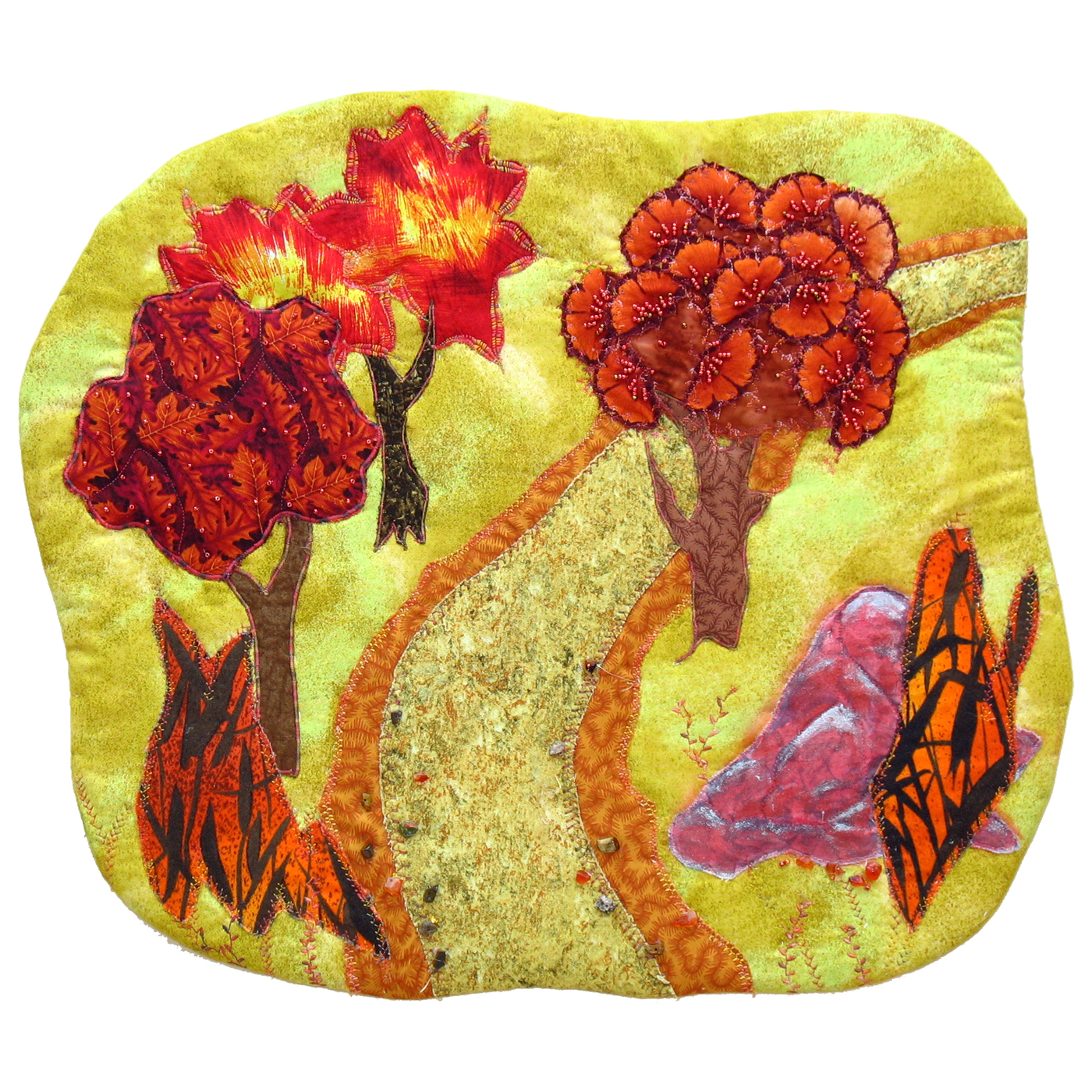 Autumn Path started during a session at the Framingham Artists Guild room with the three trees in warm red, orange and yellow tones, and they called out for a yellow background, a path leading through them, and a rock in the space to the right. That rock was originally in a rather contrasting light blue-grey shade, and that color did not seem at all right. Fabric paint saved the day to change it to a red highlighted with silver to fit in better, with some weeds in black and orange to finish it off.