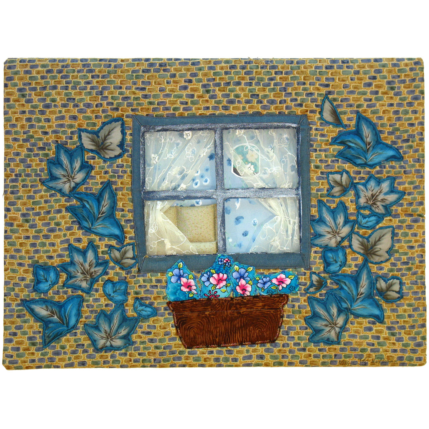 Blue Ivy continues my series of “Outside Looking In” with more of a focus this time on the outside. I was delighted to find that I had about the same blue tones in the brick fabric and the leaves.
