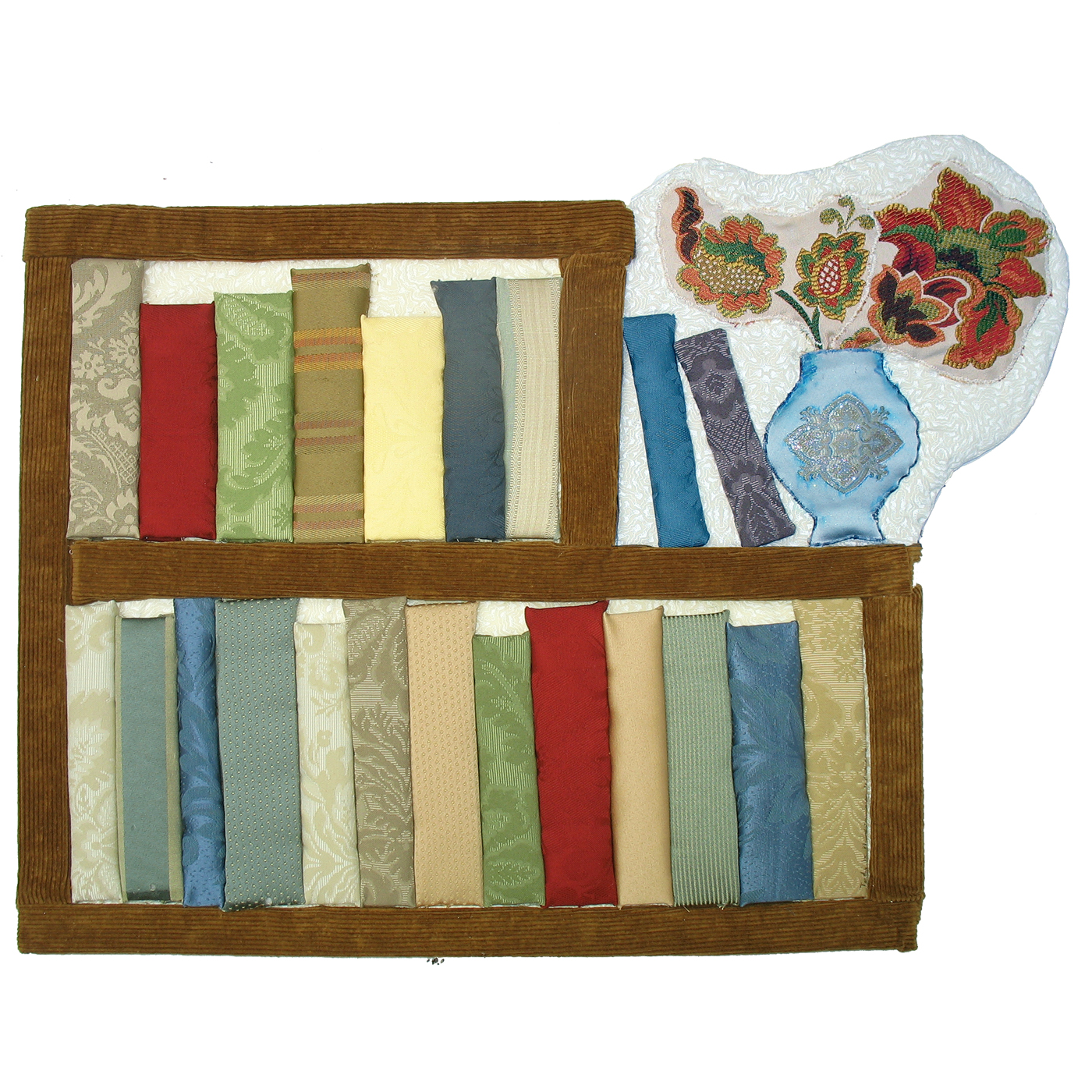 I started Bookshelf in hopes of having it ready for my April 2009 art show at Annie’s Bookstop  in Framingham, MA, but after an initial push, realized I wouldn’t make that time table. The books are made from home decorating fabrics, with a corduroy bookshelf and more home decor fabrics for the vase and flowers.