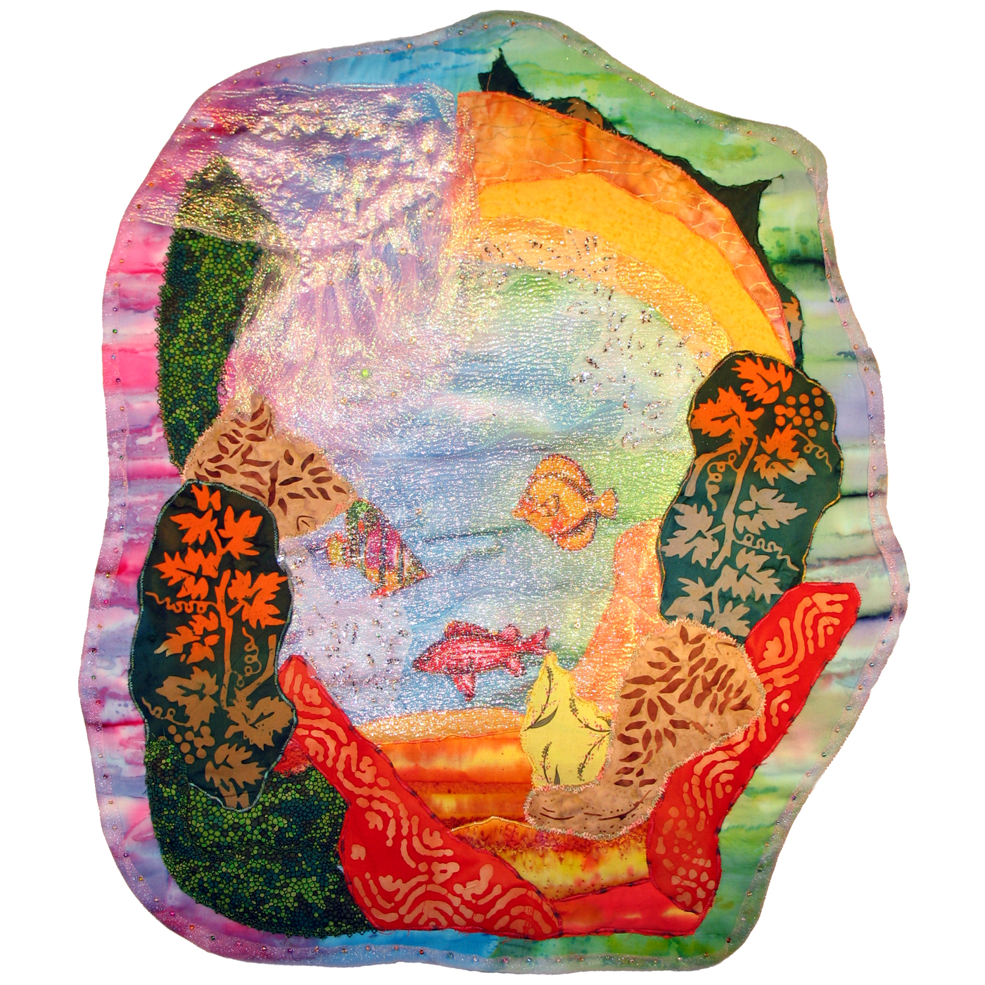 Back home, I added only a few minor pieces around the edges, and cut the fish from a scrap of printed fabric, tucking them behind the translucent fabric.