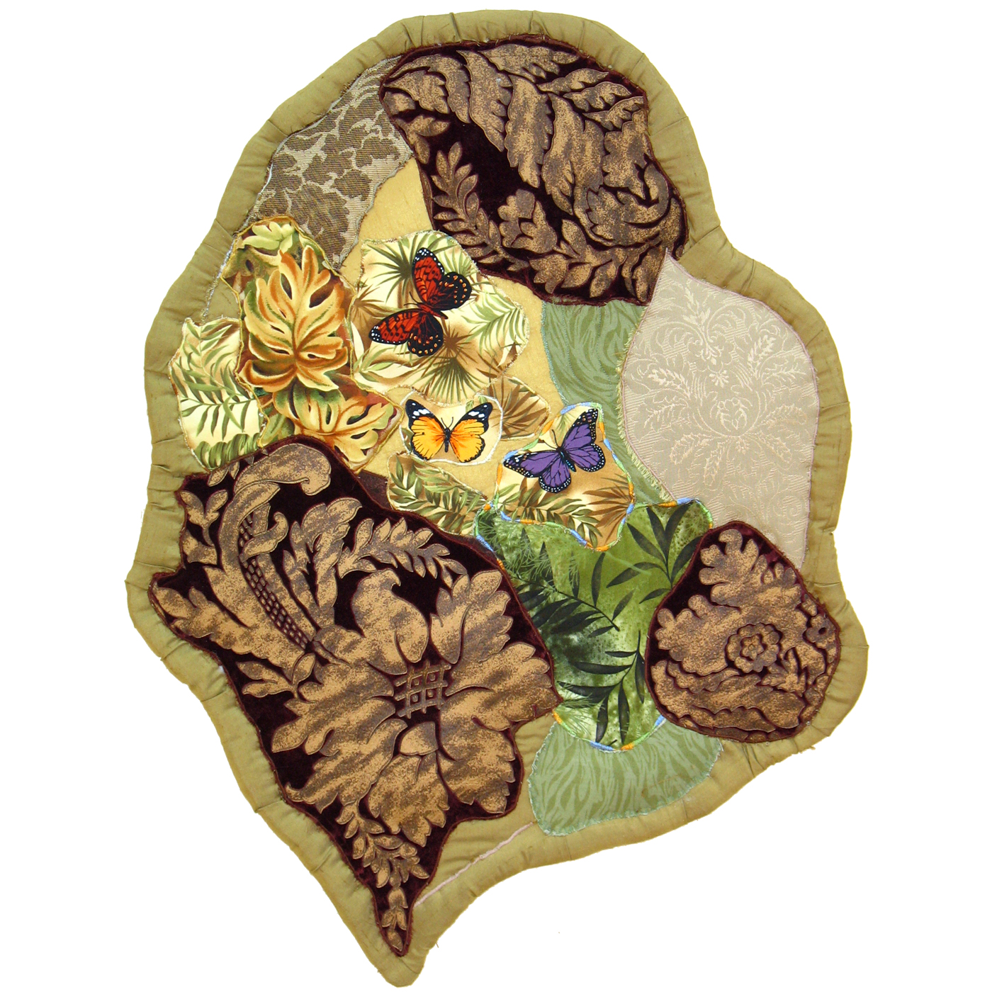 Butterflies Ascending is a collage of home decor fabric, dupioni silk, and commercial cotton prints, providing a contrast of textures as well as colors. The leafy surroundings provide a backdrop for colorful butterflies rising to the sky.