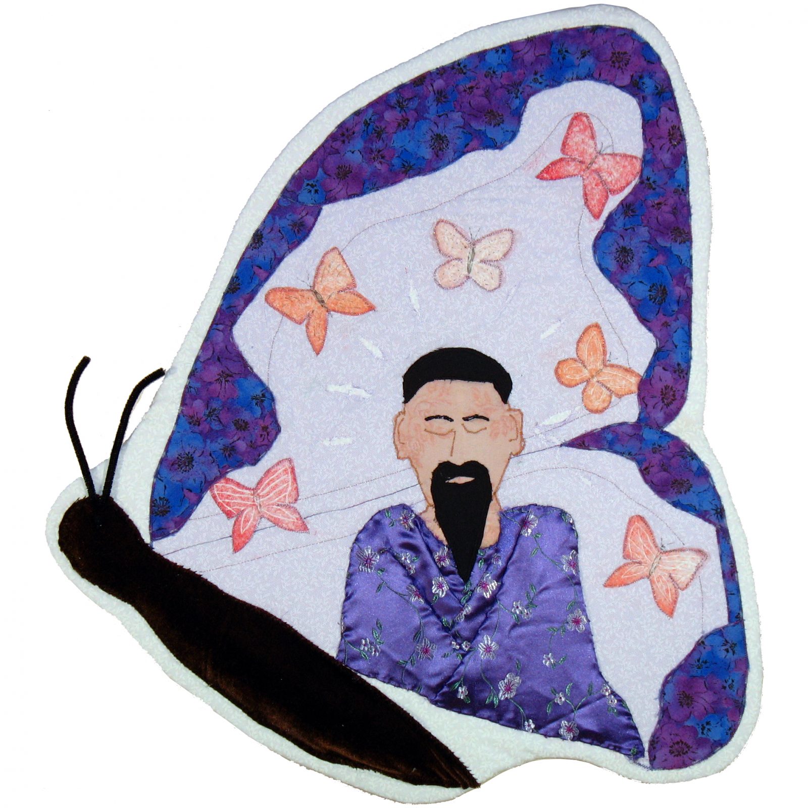 The web is full of philosophical musings about this story (alternate name given as Zhuangzi) from 200-300 BC. I decided that it had to be depicted with the contemplative philosopher meditating as an image on a butterfly wing, and originally thought of using reds and oranges, but it was the purple satin that led itself to become the sage’s robe, and the purple and blue scraps to define the wings. I made a couple of butterfly stamps and used some purple gauze as the wing surface, cutting out the other butterfly shapes and sewing the edges with coppery metallic thread.