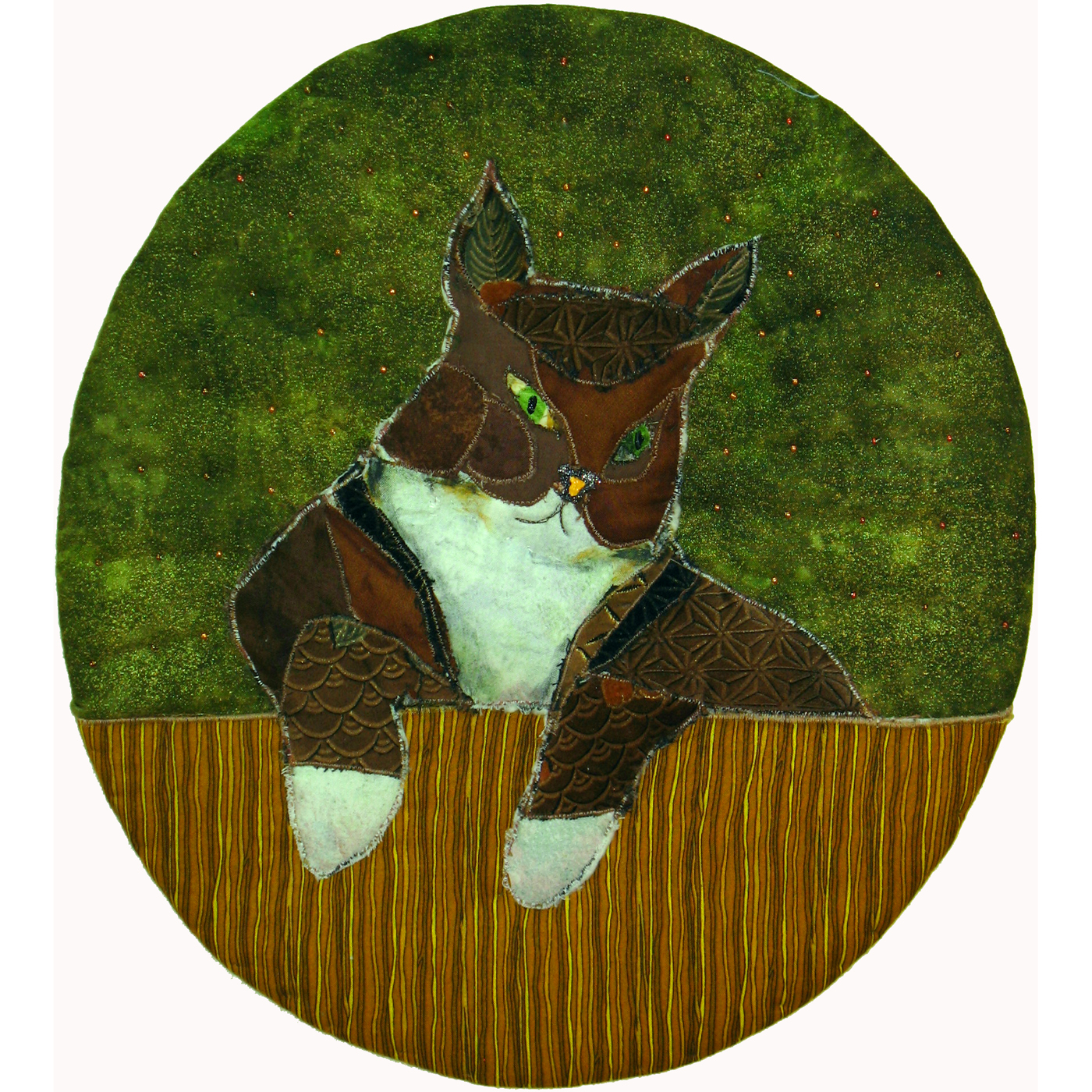 A friend at the Framingham Artists Guild brought in a photo of Calvin, her cat, and it was an intriguing challenge to try to capture that feline expression! I used a green fabric with a sprinkling of gold for the background, to bring out the green eyes a bit, and used a radiating pattern of beads to help focus in on him.  Though the original Calvin has passed, this picture is now living in the home of Calvin’s friend and mine, Sharon Cunningham.