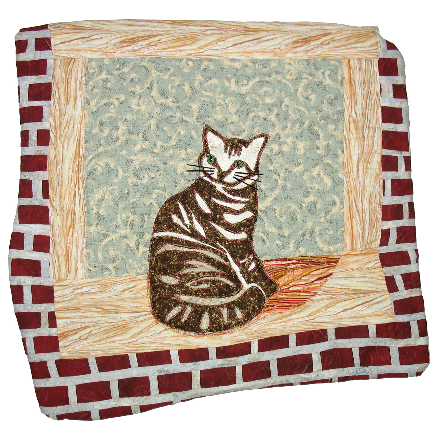 This piece came through a challenge to create an image reflecting Solitude, which brought to mind how a single cat sitting in a window will always center itself perfectly as if framed by the window and look perfectly at home there all by itself. The cat image came together rather quickly. What took more time in this piece was the brick wall edging, which I built up in strips using a more traditional piecing method than I usually use.