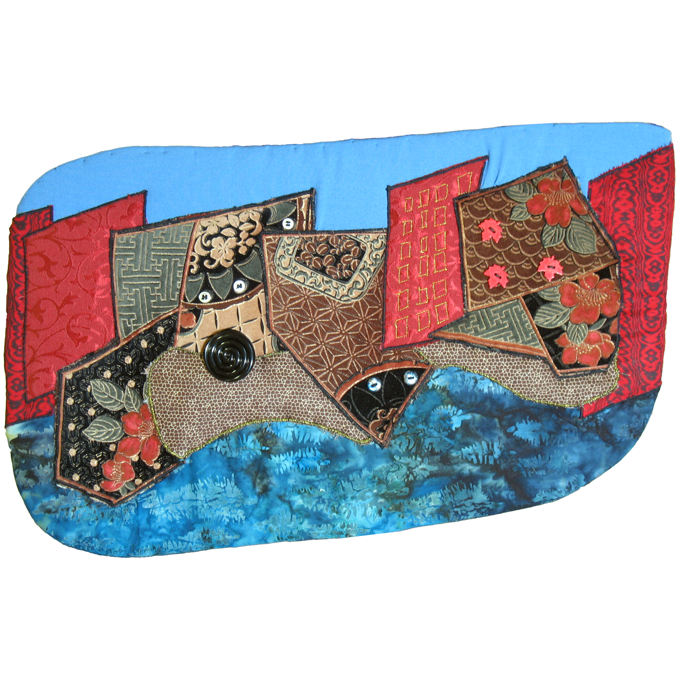 Cityscape on the River is really better as a touchy-feely kind of piece as the main fabric that I used is an Oriental flocked fabric that I picked up a couple years ago. The buttons stand out much more in this photo because of the lighting than they ordinarily do — except, perhaps, for the three red leaf buttons on the right side. What seems to have happened is that the buildings themselves attracted the buttons to themselves!