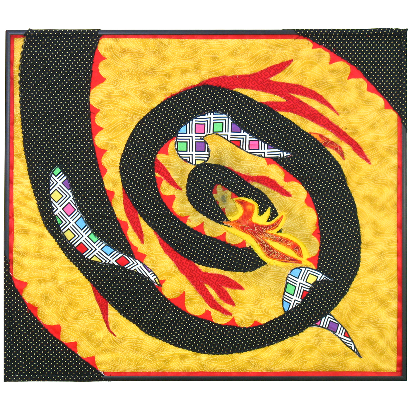This is the second of my protest pieces against the Trump presidency. It uses fabrics that I generally have not liked, pieces with a basically right-angled motif yet forced into curving shapes. Though the piece is framed, the ominous black spiral pushes and crashes into the frame as if coming out of the universe into this limited space, and appears to recede into darkness, then ends with an eruption of flame. The inner curve is lined with red spikes. At points along its length, red tendrils – more flames? – emerge, and here and there, colorful curlicues are caught up and imprisoned.