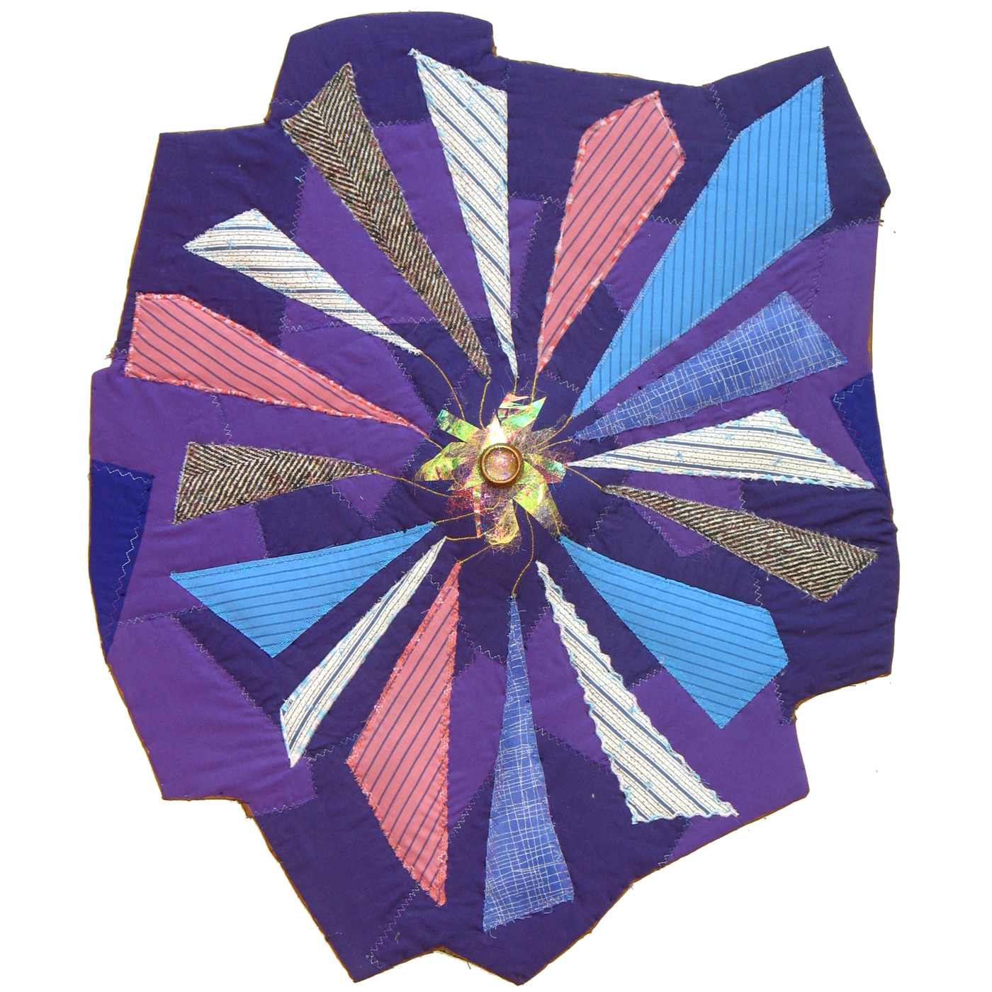 When I started this piece, it was originally meant to be a protest piece, with my plan being to depict an image of a couple of Dreamers in the center, helped by President Obama’s DACA plan and now in threat of possible deportation. It ended up on the back burner until I picked it up again this winter, and considered it to be an example of the differences and the similarities of people, in an abstract form. The center eventually was filled in with petals of gold Angelina® fiber with a button holding it all together.