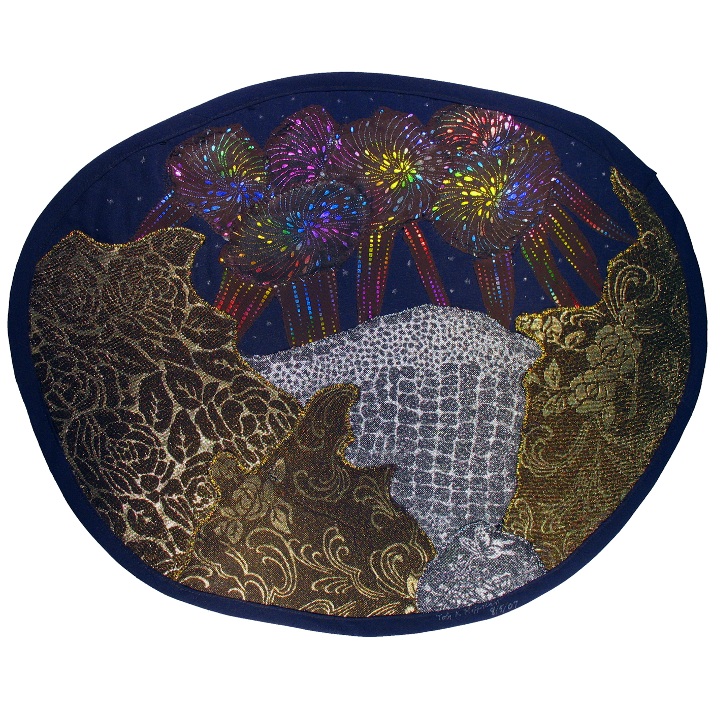 Fireworks sprang out of a Fast Friday Fabric Challenge to use material that we had not worked with before, and for me, it gave me the chance to use thin gauzy fabric samples with patterns in metallic thread. The material with the colorful swirled pattern was particularly thin, and I used some silver ironing board material to back it up, hoping it would give more emphasis to the brightness of a fireworks display. So that is how I had it as of mid April, until I looked at it again in August and realized that behind the fireworks swirls, it should be black. Once I fixed that, I felt I had finally completed this collage.