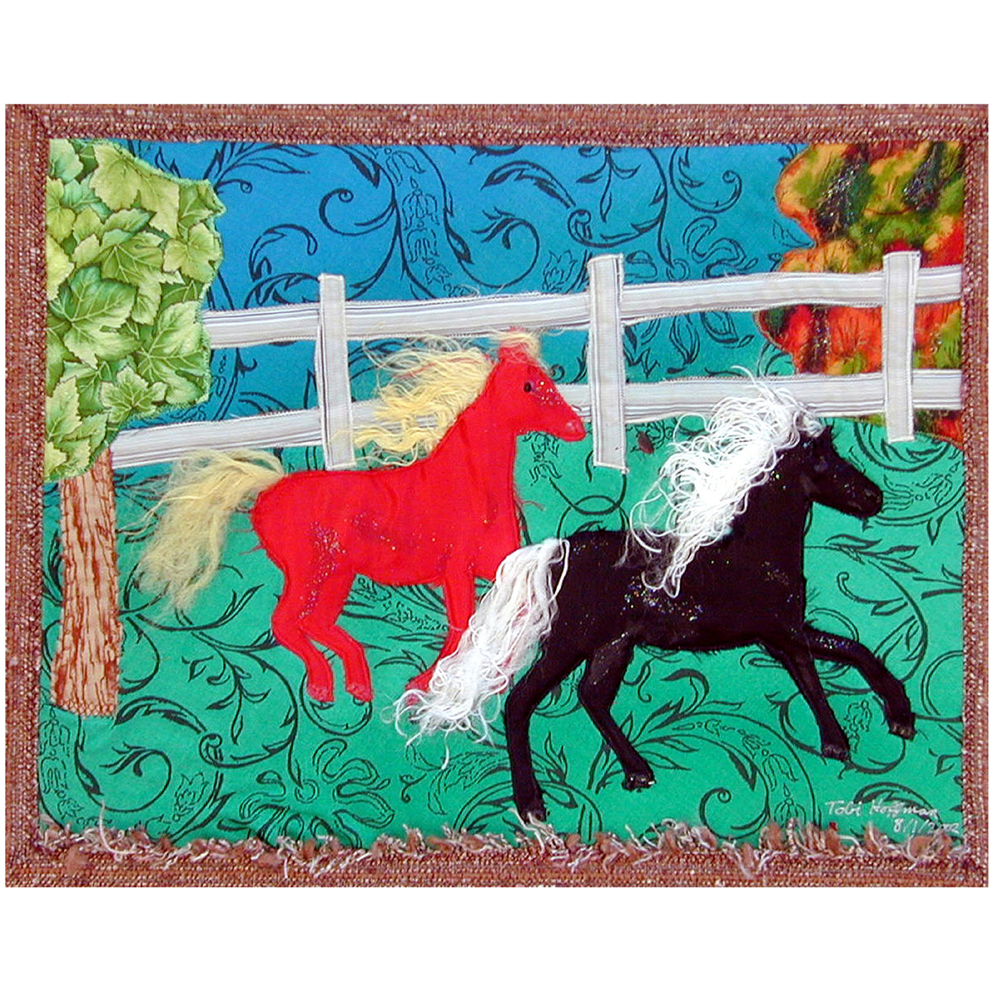 The horses are cut from shiny satin, with tails and manes flowing free, made from unraveled satin cord. The tree on the left is of the same material as in the mats, and the autumnal foliage on the right was from scraps from a shirt I had made for myself. The fence material was bought in India, and my husband Curt has a shirt made from it.