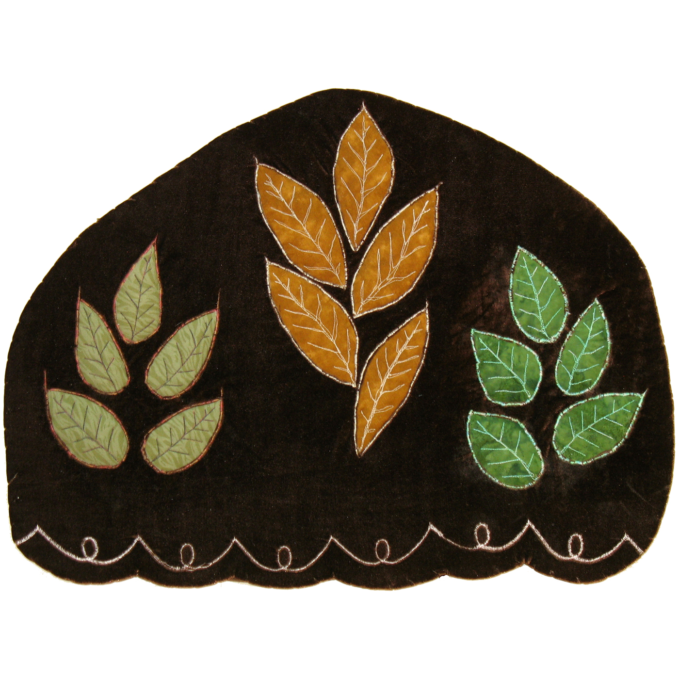 The challenge for Gestalt Leaves was gestalt principles, and among those, I chose similarity/differences, and proximity, to create a trio of plants. I used reverse applique, with the base fabric being a piece of dark brown stretchy velvet, which adds a richness to the piece. The curlicue pattern at the bottom was part of the fabric when I bought it; it seems that on the basis of a bit of an embroidered pattern, it could be imported for a lower price, as embroidery, rather than as velvet! At any rate, I chose to keep it, and when I mounted the whole piece on foam core, decided to make the lower edge echo that shape.