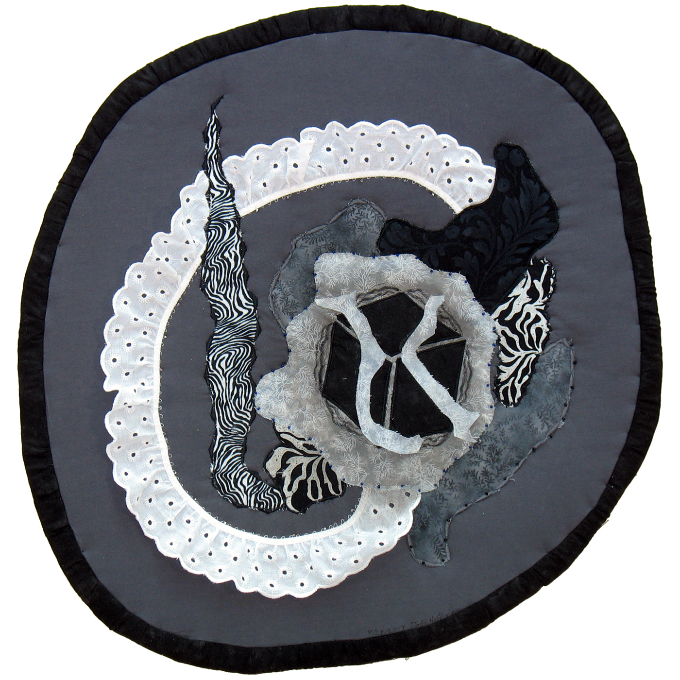 This Fast Friday Fabric Challenge took me away from my usual liberal use of color in calling for a gray scale color palette to create a non-representational piece. Looking at artwork as it would appear if you remove the color helps to see the contrast in values. Luckily I had enough of black and white fabrics plus a few grays so I could put them together. The white lace adds its own bit of dimension.
