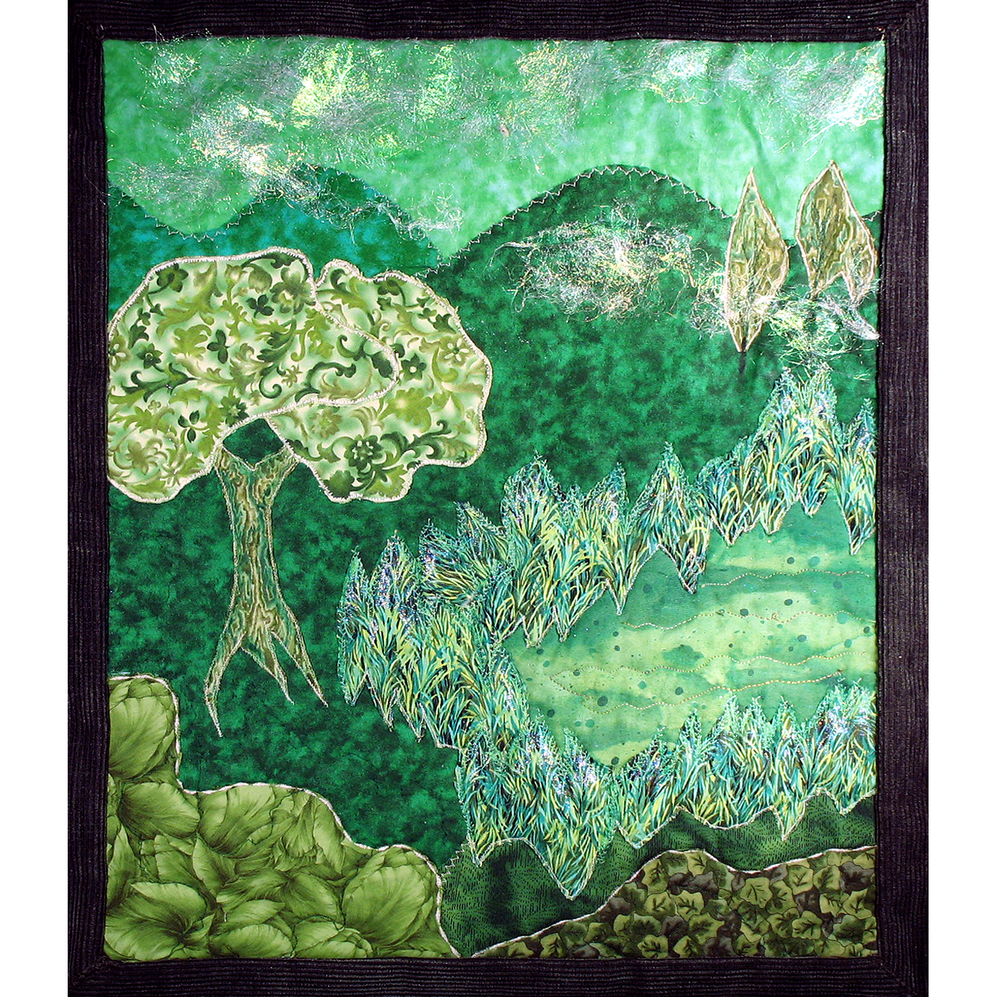 Another Fast Friday Fabric Challenge, the goal here was to produce a work based on a song with a color in its title using a basically monochrome palette. I originally wanted to focus on blue, but didn’t get a song title that inspired me! However, my fabric stash is loaded with greens, so it was only a matter of selecting which ones to use.