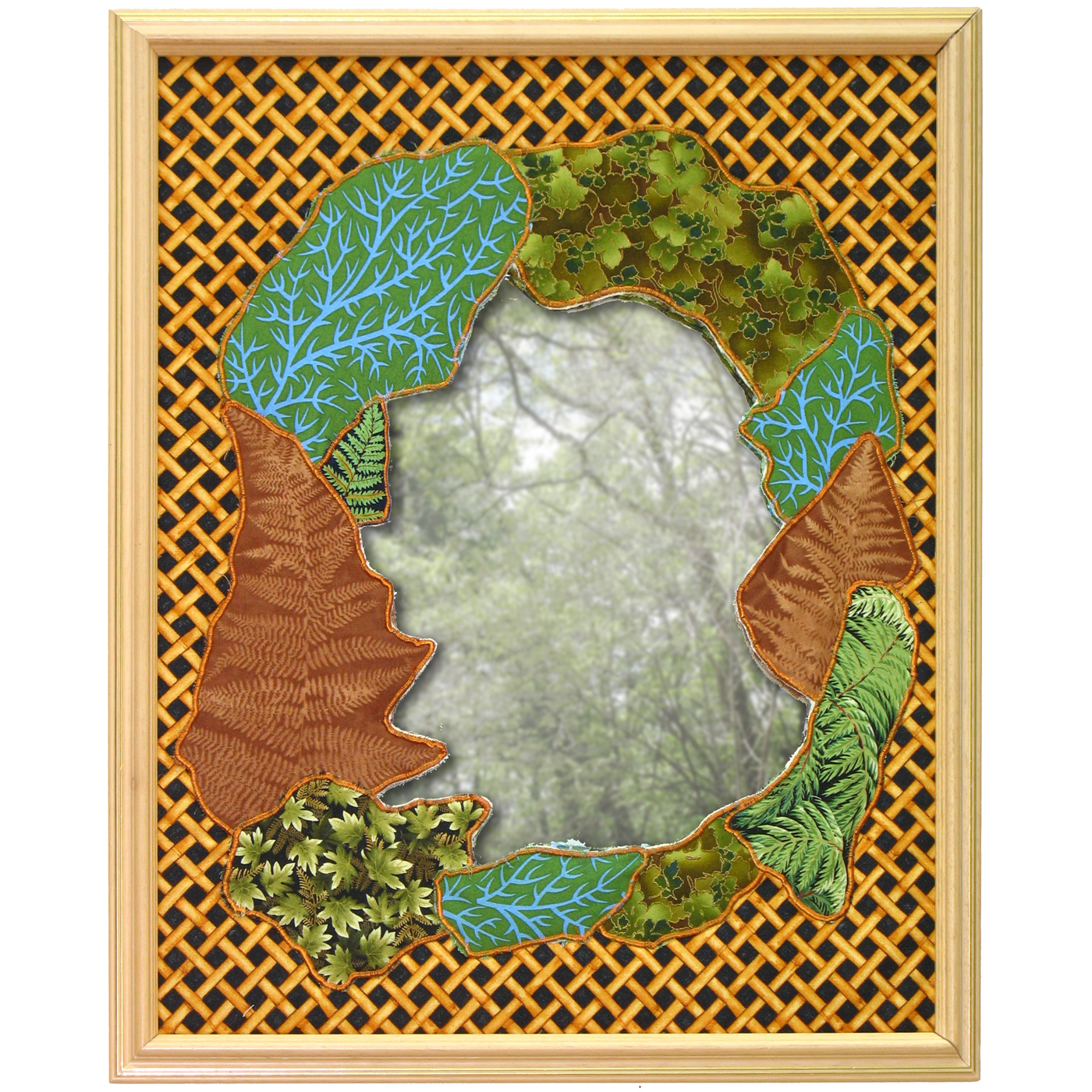 Often I have made pictures with leaves and trees around a path or clearing, but this time the clearing called out for a mirror to be framed by the vegetation. The crisscross cane work fabric was a natural background. The whole of it then fit nicely into a frame, and thus it is Greenery with Mirror. The hardest part was photographing the piece with the mirror, and here I admit to using Photoshop to put in a snapshot from my backyard. You will find yourself framed here if you see this in person!