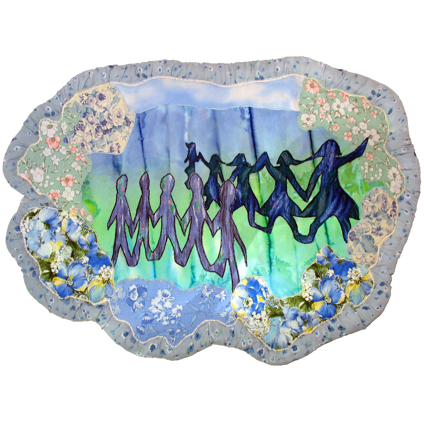 My only problem with including people in my work is drawing them, so I cut out some folded paper kids, scanned them into Photoshop and then did some tricks to change their sizes. The printout from that became my template for the children. I arranged them on a batik background and chose some flowers from various fabric scraps to surround the scene.