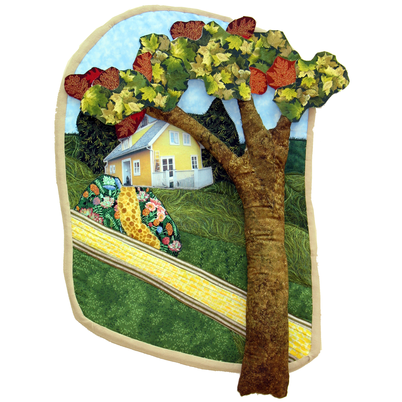 From the dream story: “… the dream scene appears before me as a piece of artwork!. It shows a large tree on the right side whose branches, covered with red and green leaves, protrude out from the surface of the work. … A narrow yellow brick road runs from the upper right to the lower left of the image. There is a small yellow house on the far side of the road.”