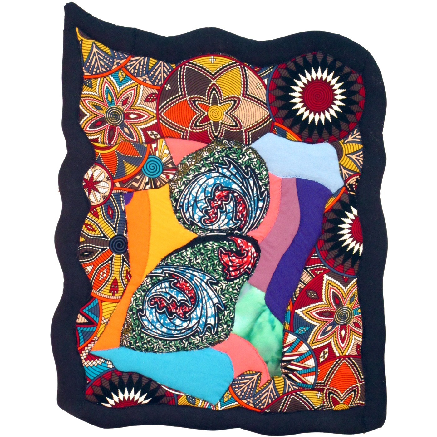 This piece feels like it is the beginning a new phase.  The original layout came through quickly, though completion took more time. Last August, we had a potluck supper at the fabric store where I work, and my husband Curt spotted a vibrantly colored African wax print that he asked me to sew into a shirt.  The remnants of that formed the basis of this piece, along with the central circular pieces from a previous shirt, also using a wax print fabric.  The solid pieces came from scraps from backing material for the multitude of COVID masks that I made over the many months of the pandemic.  What really set it off, though, was the final addition of the solid black border.