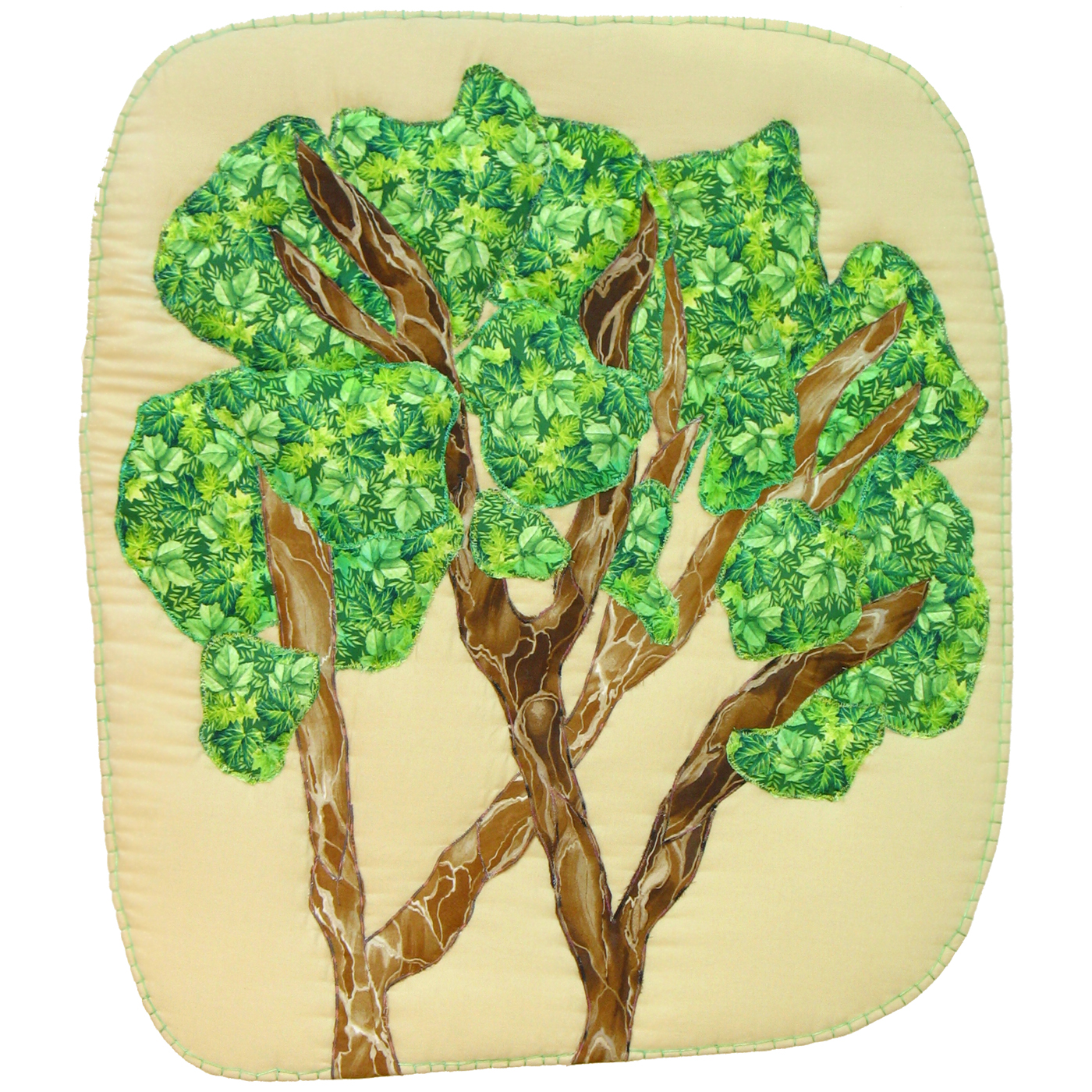 In the Treetops is one of my larger pieces, yet only makes use of four fabrics. The leafy portions were from a shirt that I made for myself, the trunks are two different colorways of the same pattern, and then there is the plain tan color of the background. My goal here was to get up close to a bird’s eye view — “where is the best place for us to build our nest?”