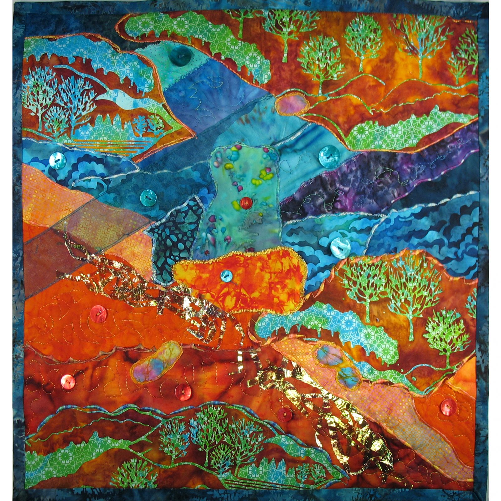 This is a “grab-bag” quilt, made from fabrics and various embellishments sent to me from another quilt artist, and she is now the owner of this piece, as I now own one made by a woman who received a grab bag that I provided. The bag I received had batiks in oranges in dark to medium shades and blues ranging from turquoise to darker blues and purple, along with some pieces of ribbon, orange and blue buttons and a generous piece of the film that Angelina is made from. Plus, there was one large piece which combined the oranges and light blues with wonderful trees and flowing lines which I knew from the start would form the basis of my piece. The fabrics were pretty evenly divided between warm and cool colors, and the pieces aligned themselves more or less along the sides of a strip of orange-y checked material, crossed with a light blue overlaid with a darker tulle-like ribbon. I added a bit of my own Angelina film, and cut them in strips before fusing them together to accentuate the orange divider; they all ended up looking orange, even though mine were a blue shade! The brightest orange and blue ended up in the center, and the buttons on those are the only ones that are different from the fabrics. The only addition I made was the backing/border material. It is not quite a landscape, not fully an abstract piece, so the title perhaps gives an indication of how it partakes of both.