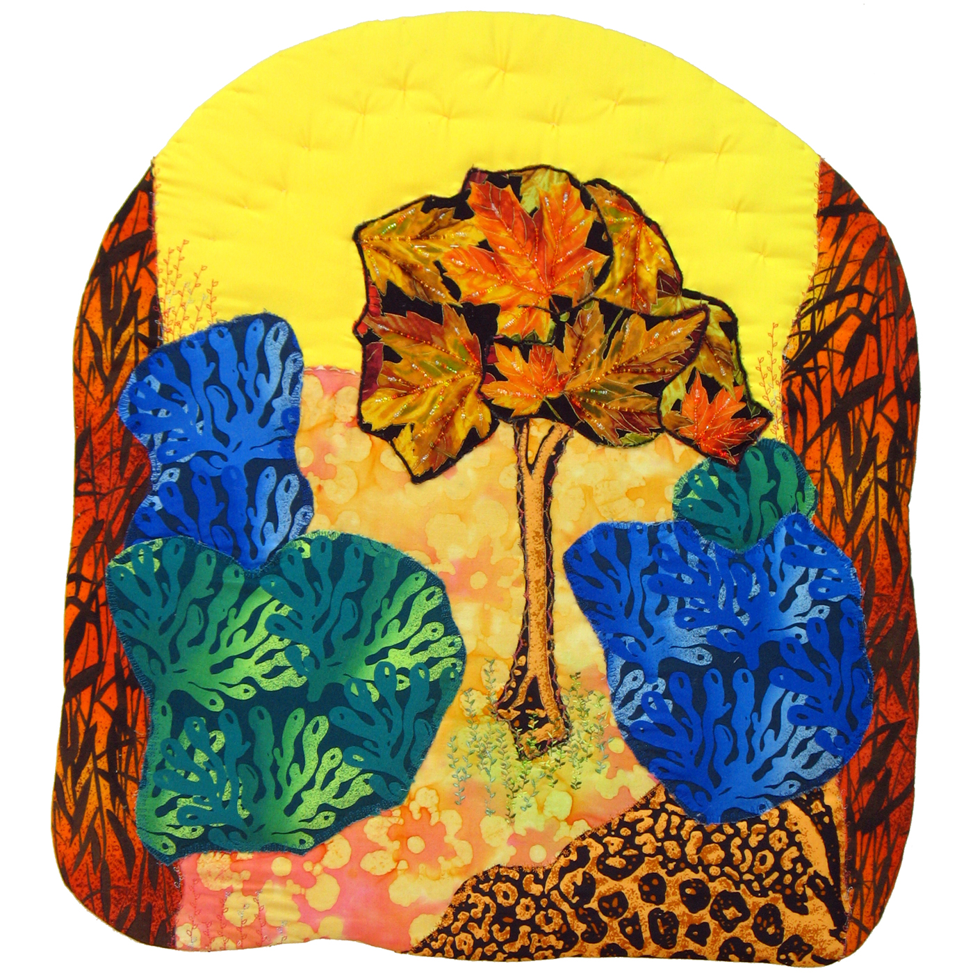 Lemon Sky contains a bit of recognizable bamboo-like growth against an orange-red background and a bit of alien bushes, along with a tree in autumn color. With these oddities already in place, grabbing a bit of bright yellow for the sky and a flowery ground which moves between light and darker orange shades fits in for an other-worldly landscape. A rocky patch in oranges and blacks helps to define a path — and in that same fabric I found a quite suitable tree trunk!