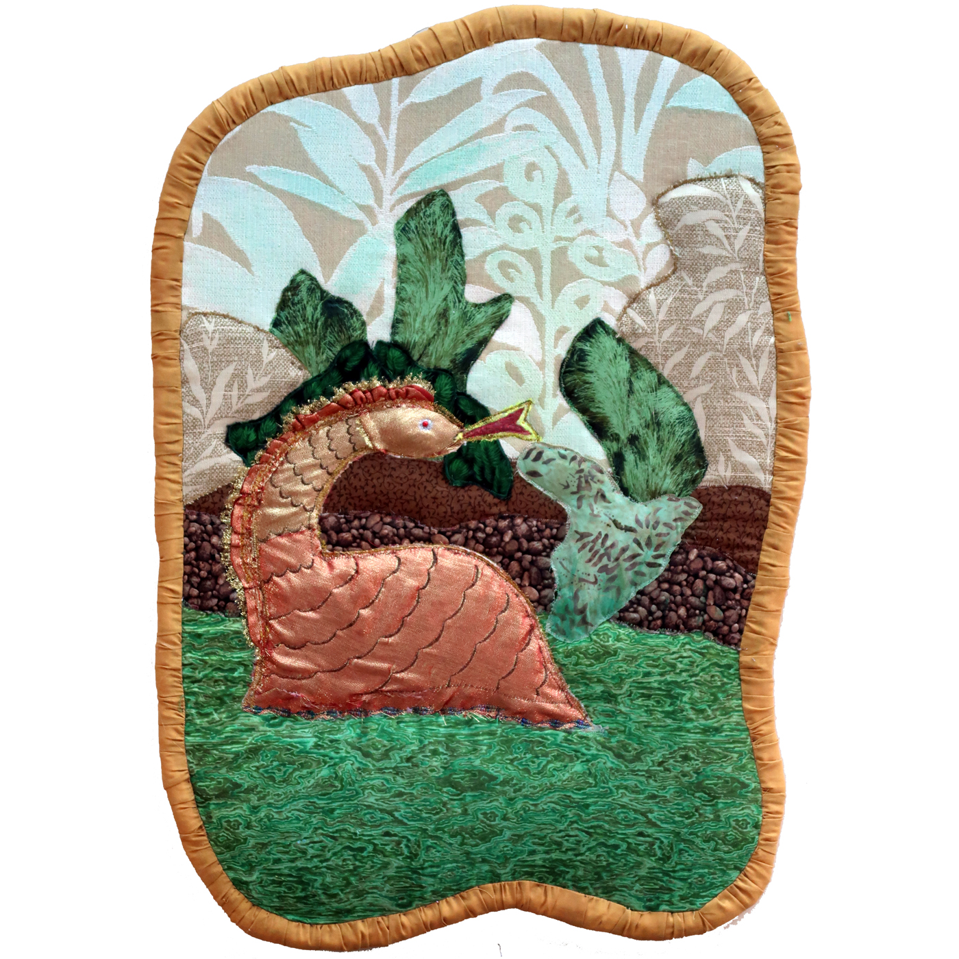 This is a collage that was well on the way on the development stage, with the background, beach and green sea, but got totally sidetracked by the wrong foreground! I had put in a dock, with a boat tied on to it and actually had it sewn in, but it was so angular and somehow out of place among the jungle surroundings, that I actually picked it out entirely. Eventually I came up with the sea serpent, with a light brown back, and stitched in scales, with its long neck and head looking back. And after I had gotten that far, a customer at the fabric store where I work brought up some fabric that was like liquid gold, and coppery-red on the reverse side, and was so glad that she did not buy the whole piece! I took the leftover piece home, and immediately knew it was the creature’s skin, with both sides coming into the picture! A metallic thread and a scallop stitch provides the scales. And even that needed a bit more: the selvedge of this piece has a gold fringe, and that, along with a bit of the copper side folded over became the ridge down from the head to the level of the water. The red eye is the head of a pin, with some white glitter behind, and finally, the whole piece had finally come alive!.