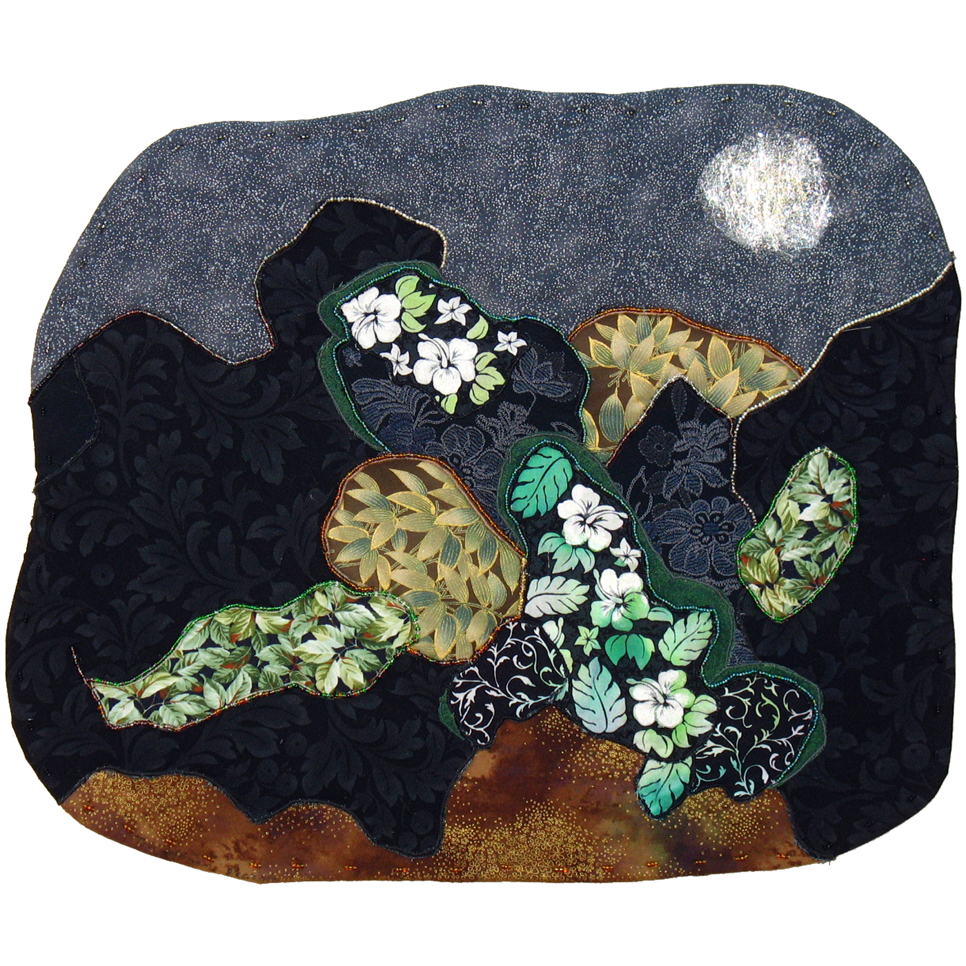 It may have been the grey sky flecked with silvery stars that started Moon Garden, along with the black-on-black that became the background. Other black, white and gray fabrics for flowers and foliage, plus a couple muted greens joined in. I then tinted some of the stark white flowers and leaves with green ink. And then it called for beads, which ended up bordering most of the shapes, at least on the upper edges, chosen in gradated colors, brighter as they came closer to the moon, which is made of Angelina® fiber.