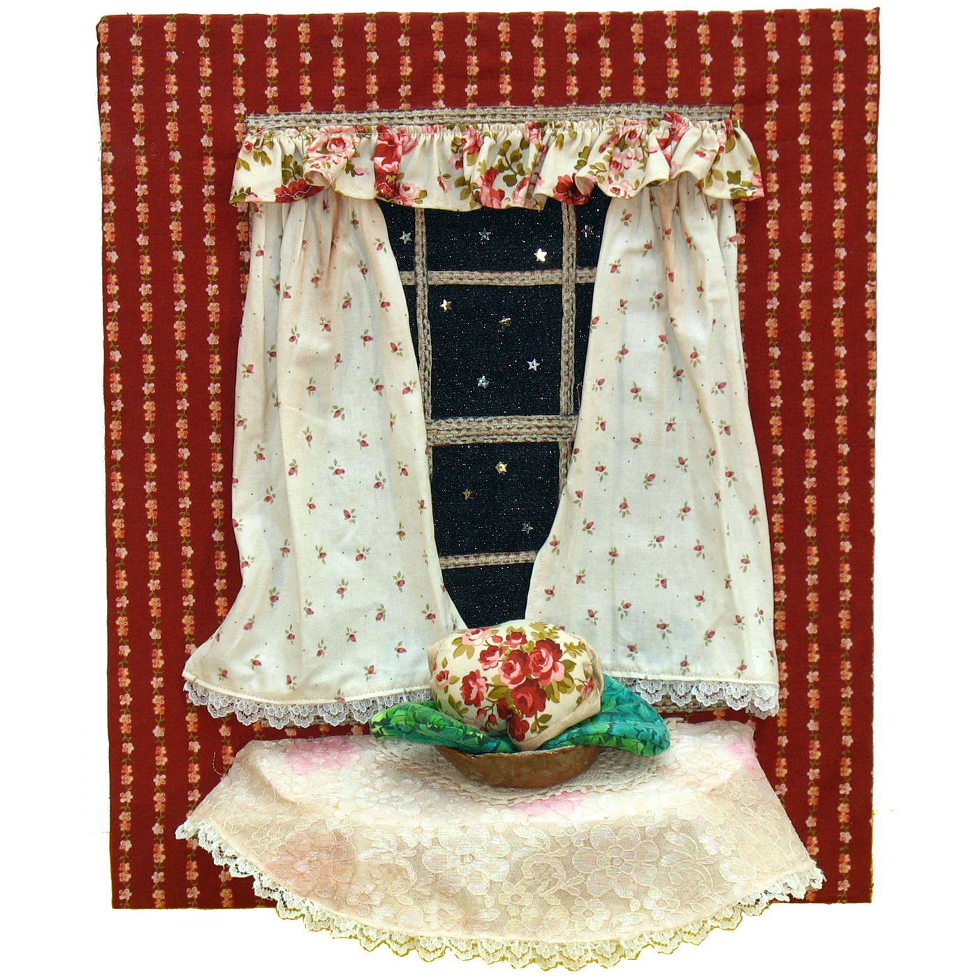 The inspiration for Night Time Window was a Fast Friday Fabric Challenge entitled “Open the Doors of Perception”, plus fabric that simply called out “I’m wallpaper!” This is a three-dimensional piece, with the curtains coming out from the background and the little table is actually a little shelf of foam core. I tea-dyed the curtains and tablecloth because they were too light for the contrast I wanted. The bowl is made out of polymer clay and the flowers and leaves are separate pillow-like pieces – the flower piece from the same fabric as the valance. The tablecloth is lace backed with fusible interfacing and edged with the same lace that edges the curtains. The black sky seen through the windows is a glimmery black fabric, backed by a dark silver. The last touch was a scattering of tiny foil stars that I came across in my stash, which I had forgotten that I had.