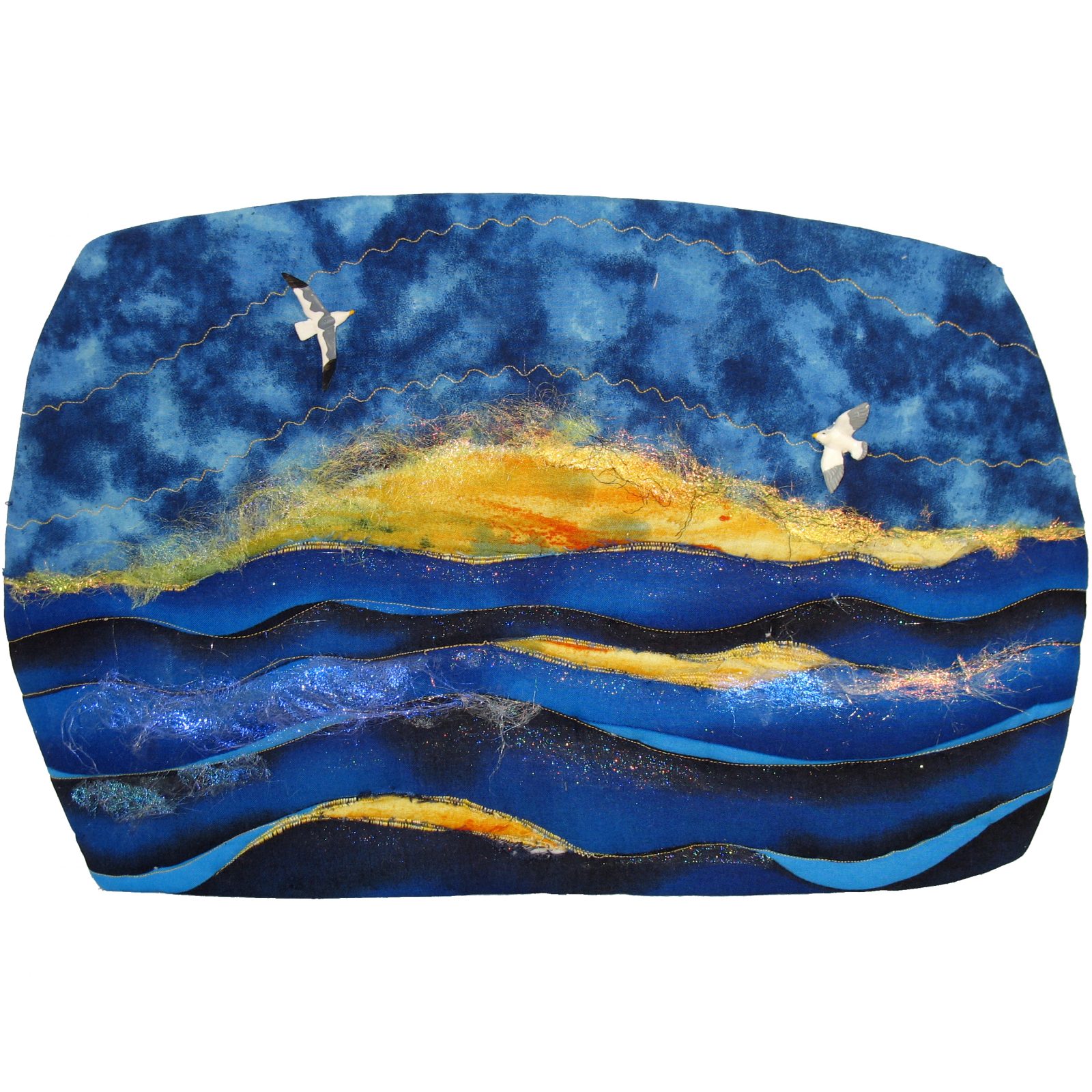 The Fast Friday Fabric Challenge for this piece was to use a palette from a favorite picture, and I chose Van Gogh’s Starry Skies as the source of my color palette, and it actually came together very quickly — except for the final touch, the birds in the sky. These I found in the course of cleaning up odds and ends of junk, and would have ended up in the wastebasket if I hadn’t had a use for them here! I used a bit of Angelina® fiber to blend the sunset colors into the dark sky and for highlights in the water.