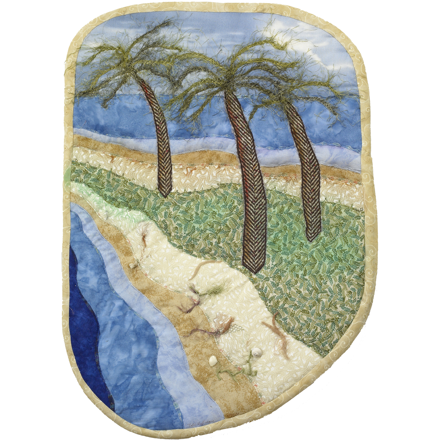The goal of this Fast Friday Fabric Challenge was to use curvilinear perspective. This made me think of lines of water and beach that converge in the distance, waves of water coming in to a beach. The near part of the piece came quickly to me, then I decided this part of the beach was a spit of land, going back to sand and water on the other side. The palm trees provide some contrast and somewhat obscure the strictly linear horizon, which certainly could not be other than horizontal! I used eyelash yarn for the palm fronds, sewn on with a cross-hatch kind of stitch that gives some texture to them.