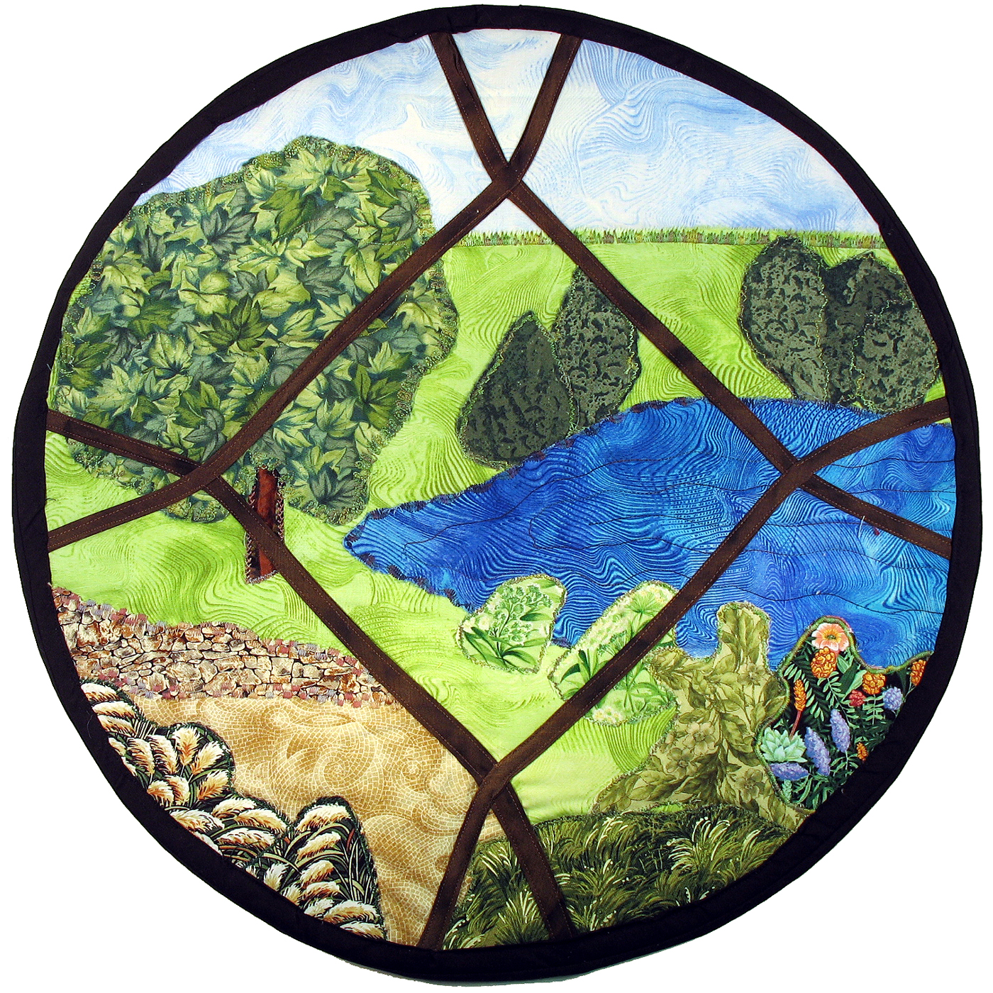 This Fast Friday Fabric Challenge called for inspiration from the first or last line from your favorite book. Well, that could only be “The Lord of the Rings” by J.R.R. Tolkien, and the first line refers to the upcoming party for Bilbo Baggins’ eleventy-first birthday! Since we visited New Zealand in March of 2005 with the goal to visit as many sites as we could where the movies were shot, I had a photo of the party field, taken from the round window of what still remains of #1 Bag End, and that became my model for this piece.