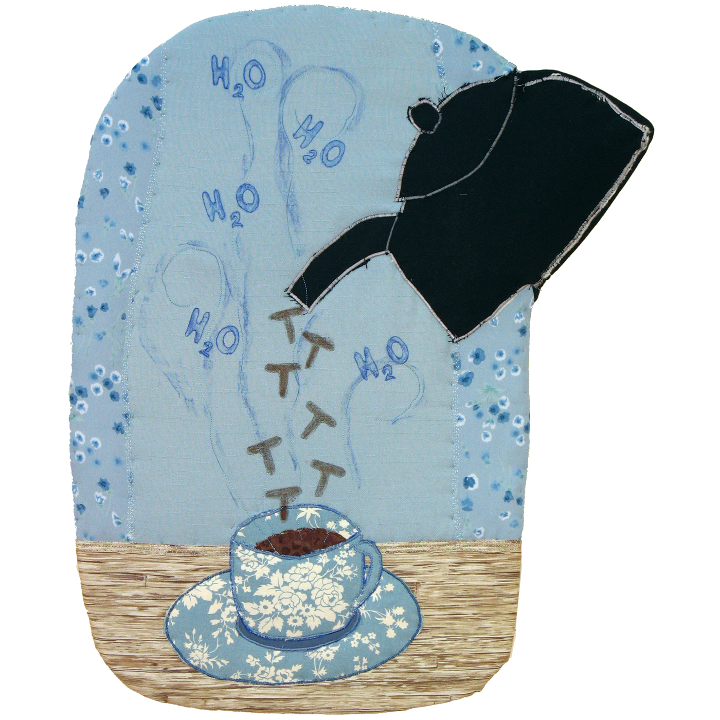 This was my answer to a Fast Friday Fabric Challenge to choose a letter and illustrate it in the “A is for Apple” style – but not necessarily a commonly thought-of image. I chose to go with a black kettle literally pouring a stream of letters. My original thought had been to cut the kettle off at the edge, but it insisted on remaining whole and going off the edge. No handle, this kettle can pour by itself!