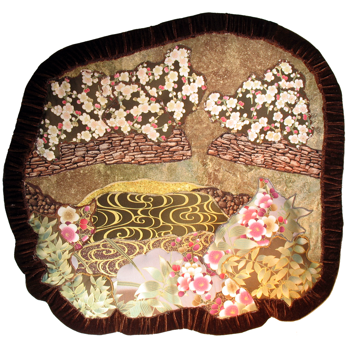 The stone wall came from fabric I have used before; the gap suggests a path leading beyond. Cherry trees look out over the wall