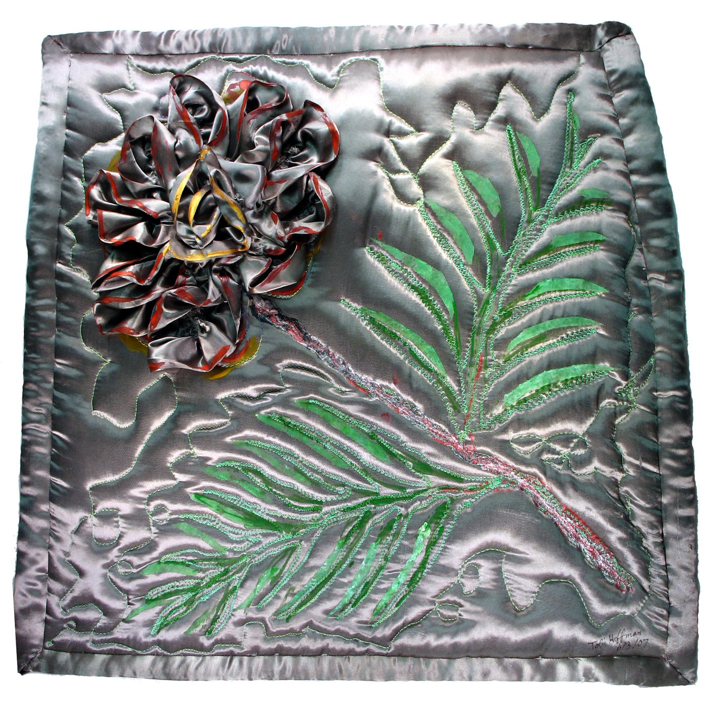 This Fast Friday Fabric Challenge for this piece was to create a work based on a single fabric; I chose the gray satin which I have in unexplained quantity in my stash! I used several layers of high loft batting and created the leaf shapes and stem with thread painting. The flower is a number of long strips of the satin gathered into ruffles and coiled onto the background. A few touches of fabric paint helps bring out the shapes, and whole piece is edged with more satin, bound onto foam core in a shape that is as you see it; it did not want to conform to your standard rectangle!