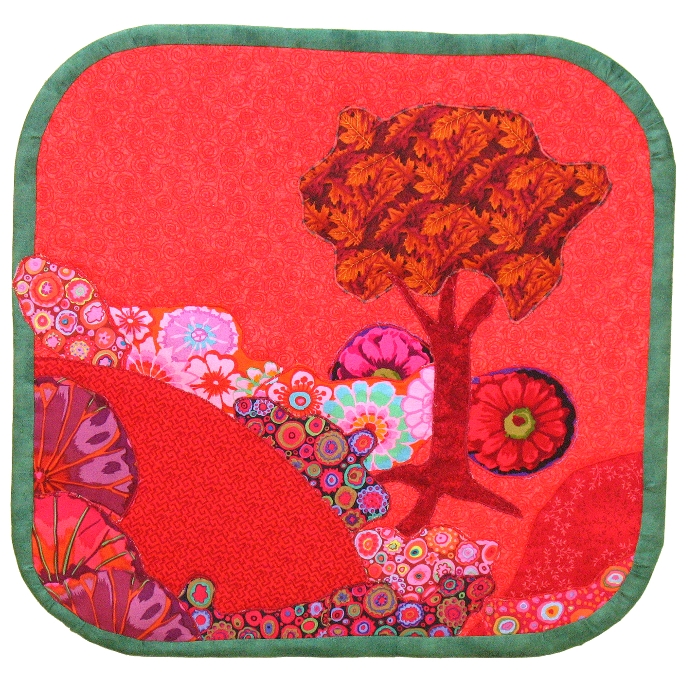 Scarlet Serenity grew from four red patterned fabrics I received in a bundle of red fat quarters, plus some wild designs in 5″ squares that I won last spring which were Kaffe Fasset patterns, plus the orangey-red leaf fabric which formed the tree. The green border was suggested by some fellow artists to offset all that red, and help a bit of the green show up in the small circles.