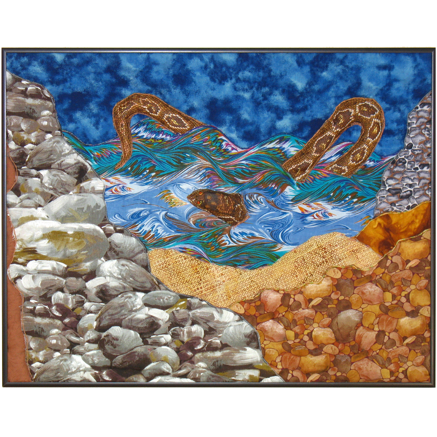 My stash has a variety of fabrics with rocks, and they occasionally assemble into a beach scene. This is one that I had put together some time ago, but the fabric for the water was just not right, until I found this rather wild pattern of choppy water. This was quite an improvement, but what was missing? A never-before-used piece with an overall snake skin pattern provided the last piece which became the sea serpent, and the completion of the serpent was his head that actually comes out of the surface of the piece.