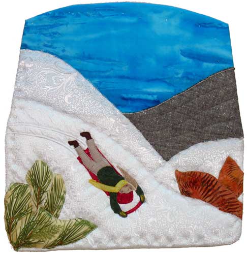 The lovely white-patterned satin became the stimulus for this winter scene, with a sky of that brighter than believable blue that winter sometimes gives us, with just a hint of leftover clouds. And what are snow-covered hills good for? To a child, they are for sliding down on a sled, again and again! A bit of frost-killed foliage and a bit of pine needles give more shape to the picture.