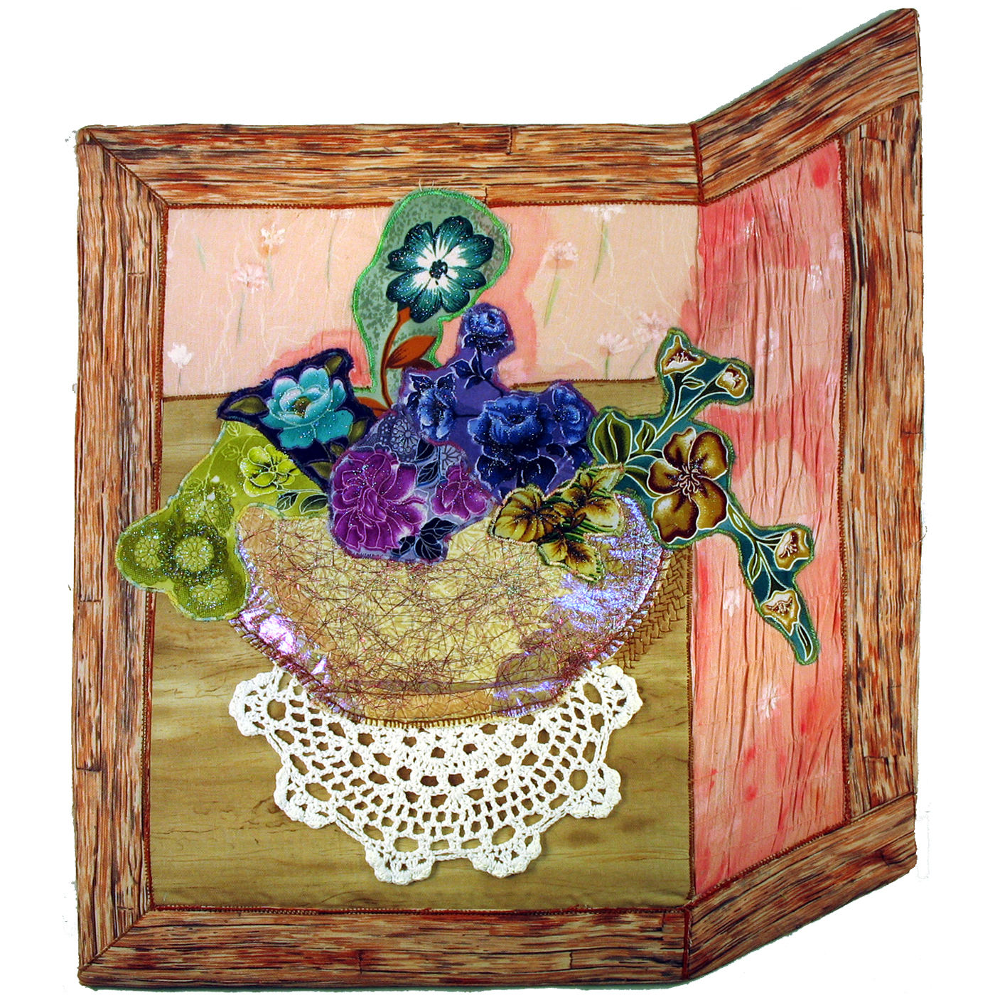The first Fast Friday Fabric Challenge for 2007, this month’s theme was a still life using techniques to show dimension. I tried using the shape of the piece as if the bowl of flowers were sitting on a table at a corner of a room and a hall going back, and it was only a partial success, I’m afraid! However, when I put the picture on my desktop at work, the first reaction when I showed it to a co-worker was “Is that flat?”, so it worked to some extent!
