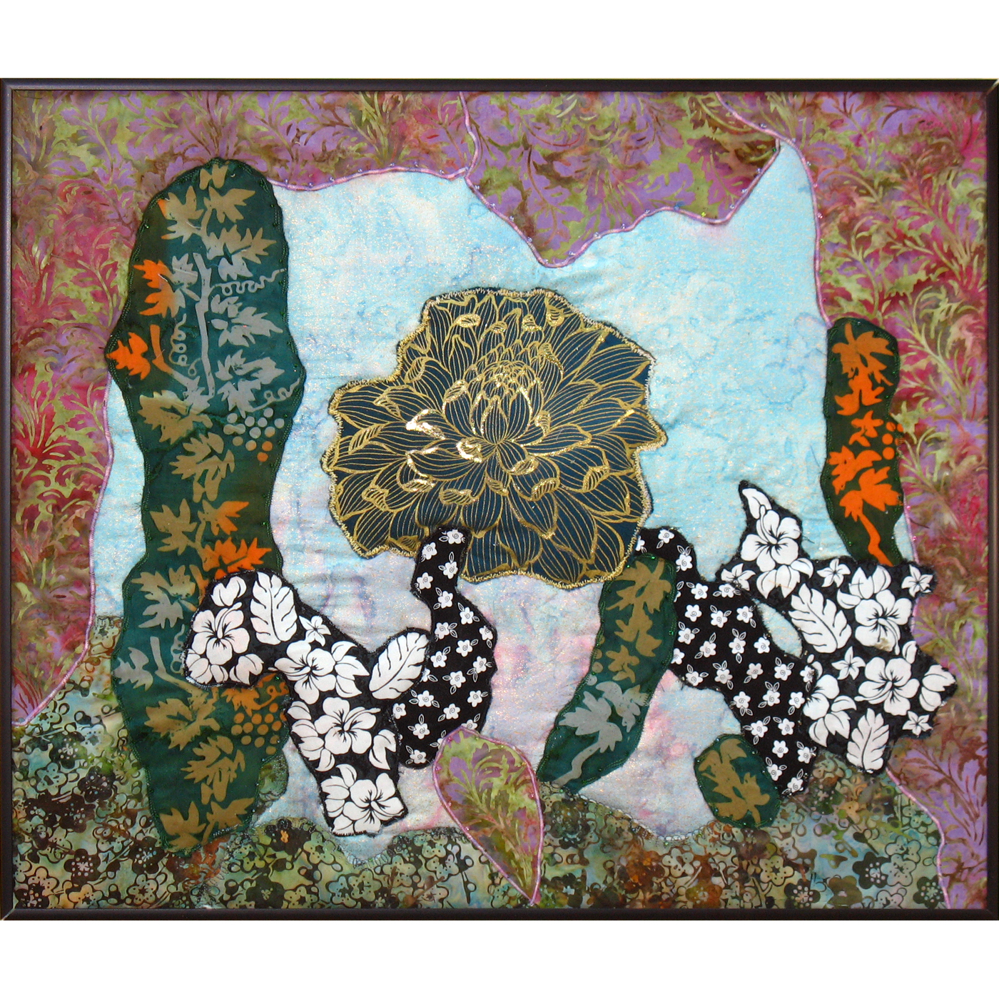 Batick fabric fascinates me, but I find it hard to use. It forms the frame of this piece and a bit of foliage, though not the center flower. The black and white flowers form a nice contrast, and the center flower is enhanced by a bit of gold foil.