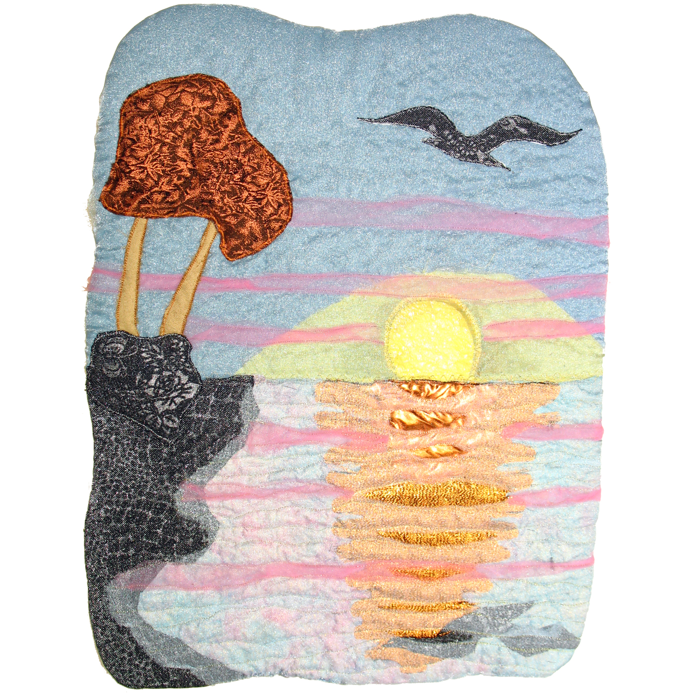 Sunrise always seems a time of optimism, if you are awake enough to enjoy it! And optimism is the theme word for this Fast Friday Fabric Challenge, along with the use of metallic tones. I had picked up the material for the tree fairly recently, not sure what I would use it for, but the copper fits this theme, especially since I made the sunrise reflection from other coppery fabrics. I layered fabrics for the sea and sky, with the top full layer being a sparkle organza. The organza puckered as I sewed the seagull on, but in a way, that seems to enhance the image. The pink lines are scraps of tulle to add a sunrise color.