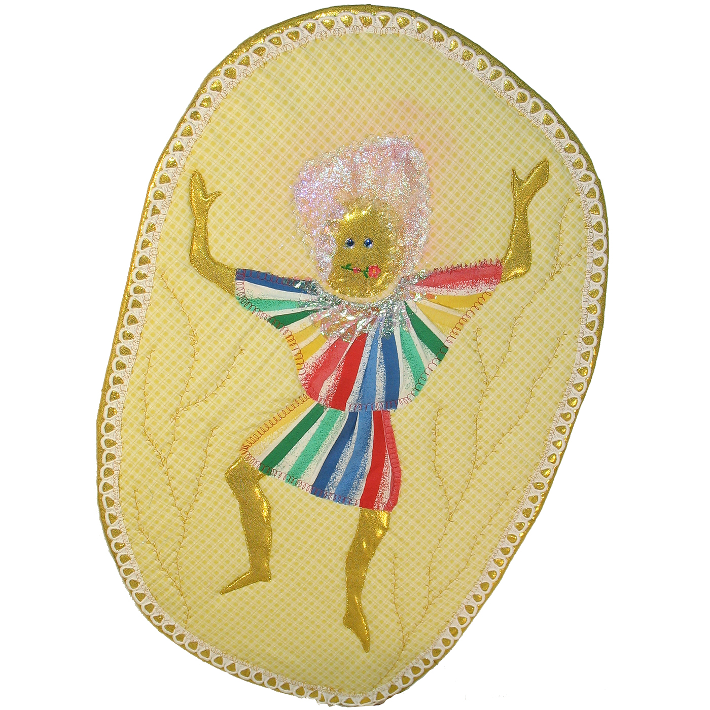 This Fast Friday Fabric Challenge called for the expression of a mood through color. The colorful striped fabric started me out; I folded it so that the colors radiated out for the dress. The gold fabric entered into the picture just for the body, but it worked well for the border, with a lace edging over it. I used Angelina fiber for the hair and collar, along with a bit of Lumiere , sequins for the eyes. I had found a tiny gold rose for a flower in the dancer’s mouth, but lost it, so I made that out of fabric paint. And the background is from a piece that I bought for His Dream. At any rate, that fabric is not quite something I would generally use, but it added a bright background.