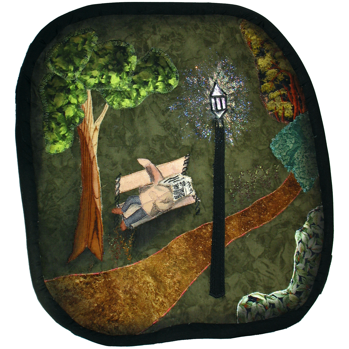 This is a Fast Friday Fabric Challenge piece where elements of chiaroscuro were to be used, with a point source of light. The basic image for this came together quickly, but I spent more time in implementing it! I generally start with a piece of muslin to put things on – and the piece I pulled out already had a lamp post and a path drawn in, long enough ago that I forget what I had planned. However, a lamp post is certainly a source of light, so I went with that, using some Angelina® fiber for the light, and a bit of tulle for the rays emanating from it. I added some glitter paint as a last touch.
