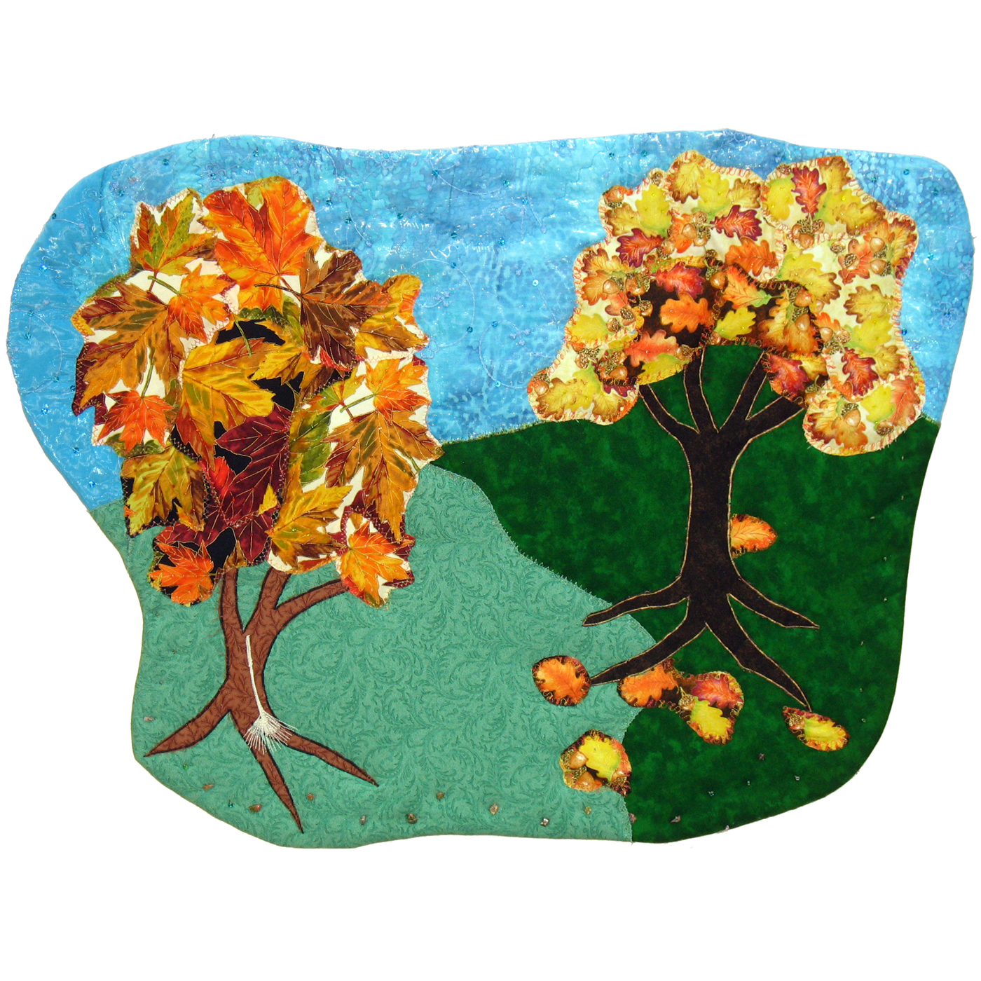I love to find and use sets of fabric with the same patterns but different colors. In this case I found two such sets, one of maple leaves and the other of oak leaves — but the difference was only in the background; note that some of the leaves, in both trees, have a pale yellow background, and others have black instead. I used the black background in the center of the trees, the yellow for the outer leaves where the trees are less dense.