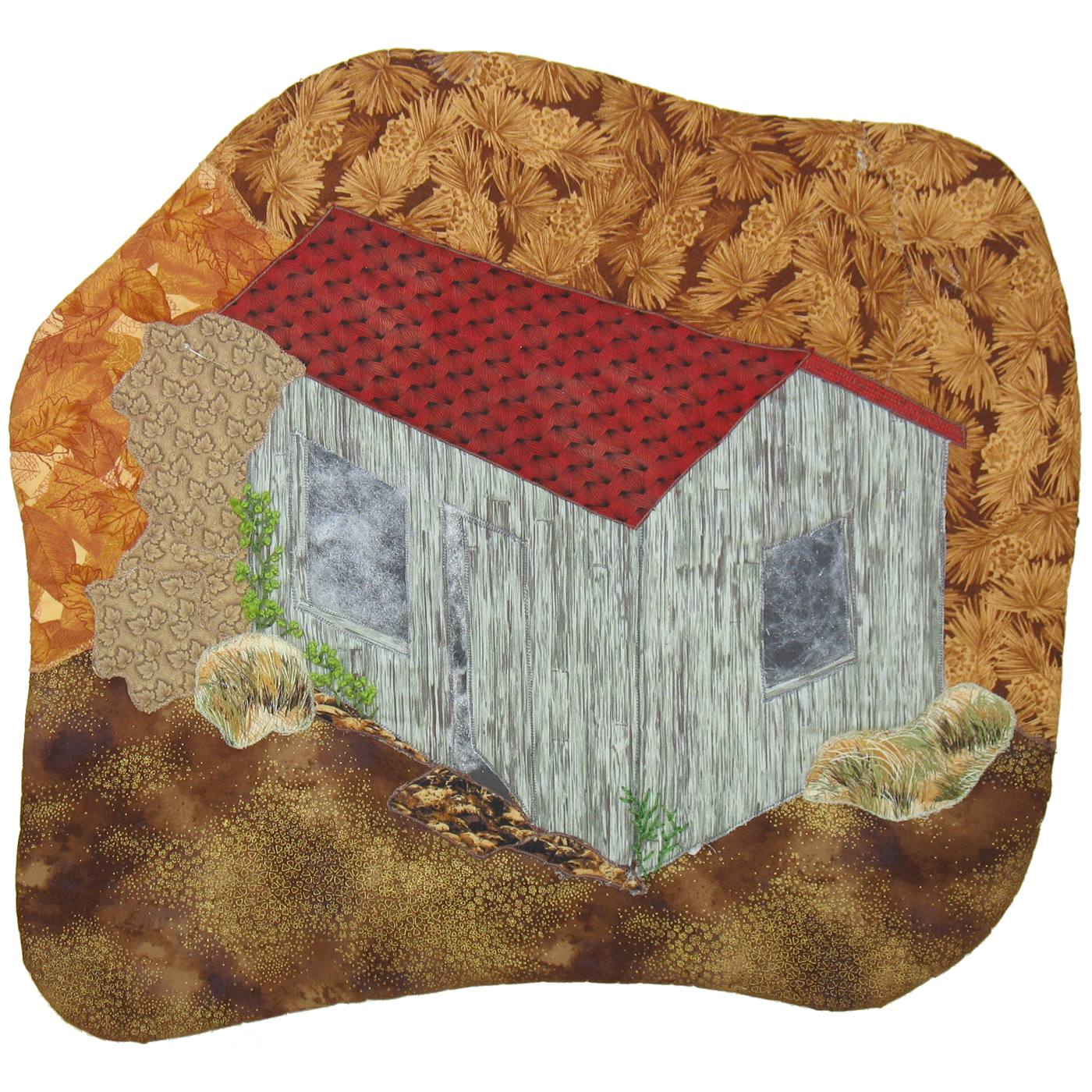 A fabric pattern of weathered looking grey wood just called out to be this small shack, which looks to have been long abandoned, surrounded by woods in an autumnal glade. The interior is dark, filled with cobwebs — who knows what might be inside.