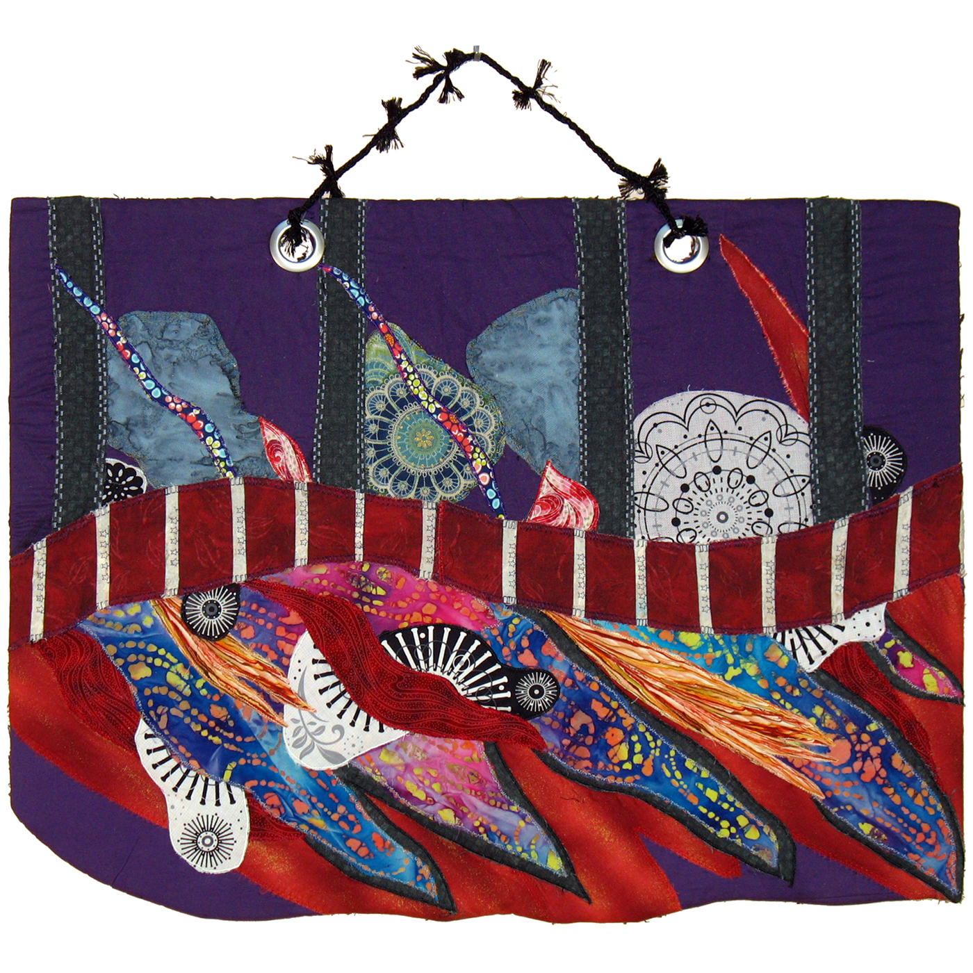 I have again used some fabrics that have seldom been part of my art, though I did use some of the circular motifs from The Wheels Will Still Turn. The slime oozing from underneath represents the poisonous nature of the wall, and the smoke and images on the far side of the wall indicate that it will do no good to those on the other side either.