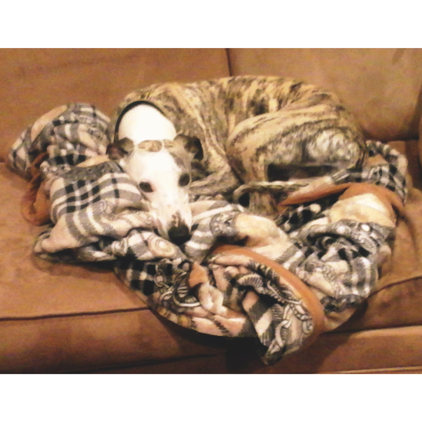 A change from my usual — a photograph! Look carefully . . . a brown couch … a brown and white blanket … two eyes … and look further, the rest of the dog! Laszlo is my oldest son’s greyhound, who made himself at home when we were both visiting with my youngest son, after the birth of my first grandchild in San Jose. The image was not one to be ignored, and the photo came out even better than I had expected.
