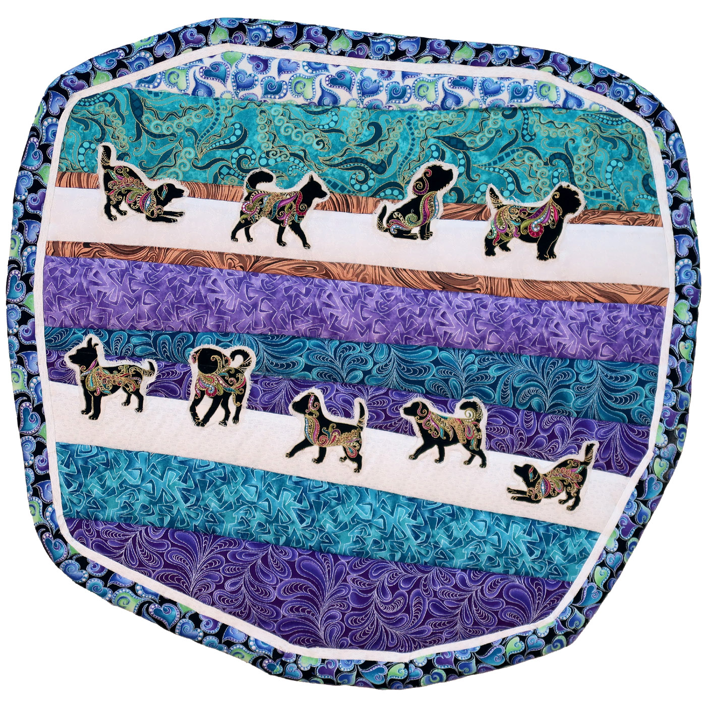 I started “Woof!” with strips of fabric left over from my next-to-last piece, “Miaow!” and initially made a downward leading white path, placing several decorated dogs walking down it. It sat for a week or so until I realized that it was too small, and added more strips and another white path. I then separated left-facing dogs and right-facing ones on the two paths. Though sloping down from left to right, like the first path, this one is definitely upward, because that’s the direction for the dogs walking along it!
